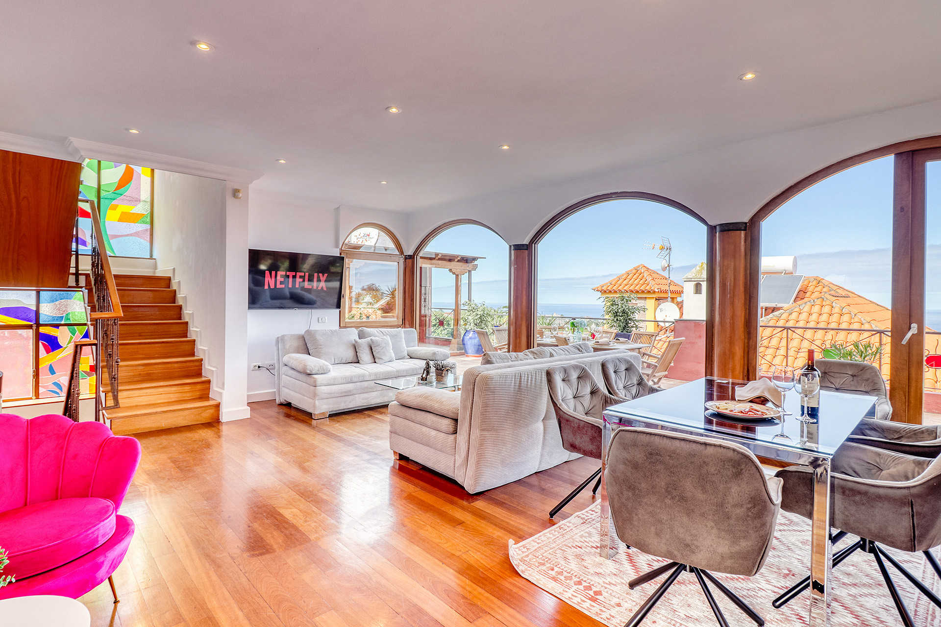 Die Villa verfügt über 4 Schlafzimmer (1 Kingsize-Bett, 3 Doppelbetten) und 4 Badezimmer. Das Wohnzimmer ist großzügig und mit dem Essbereich verbunden.