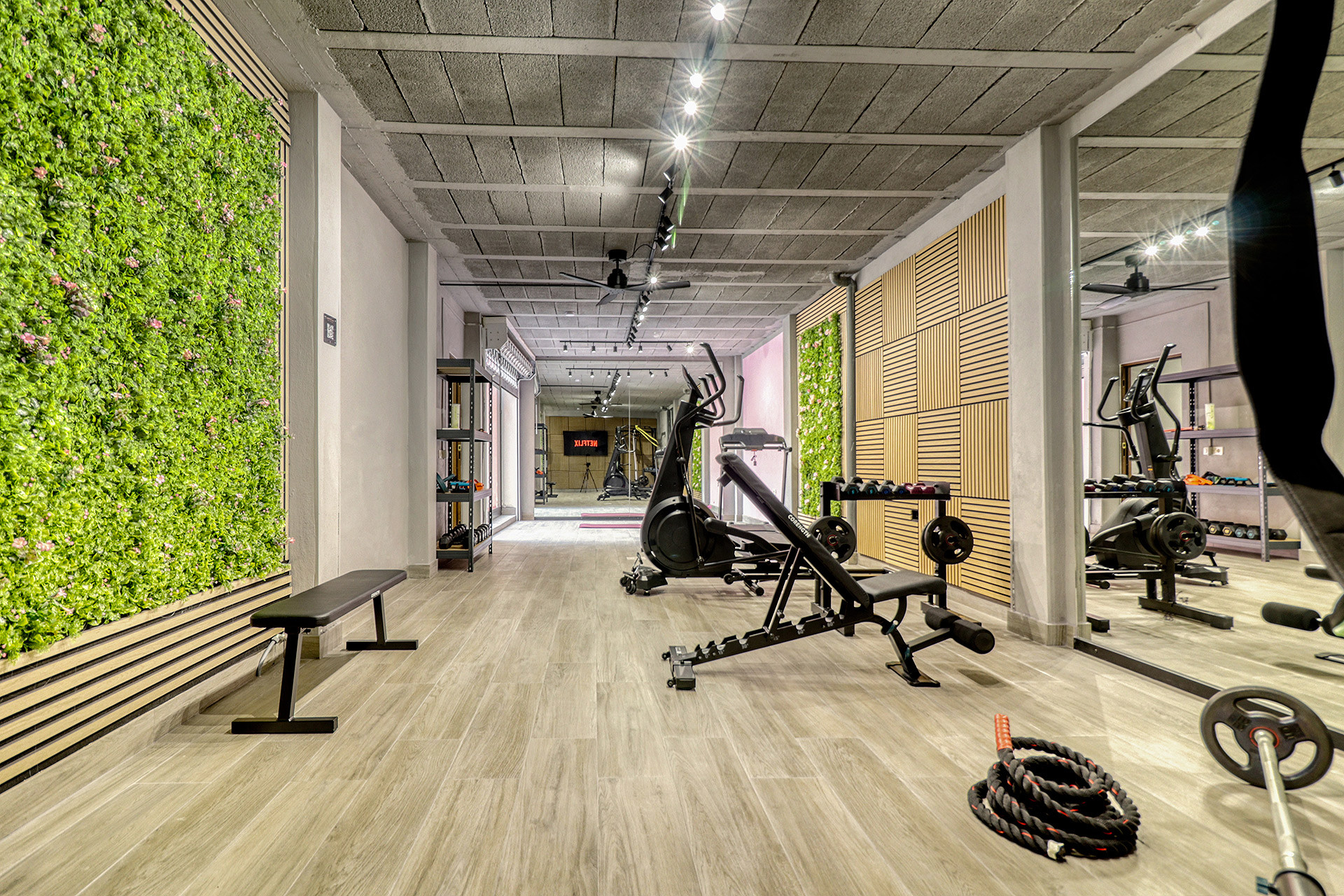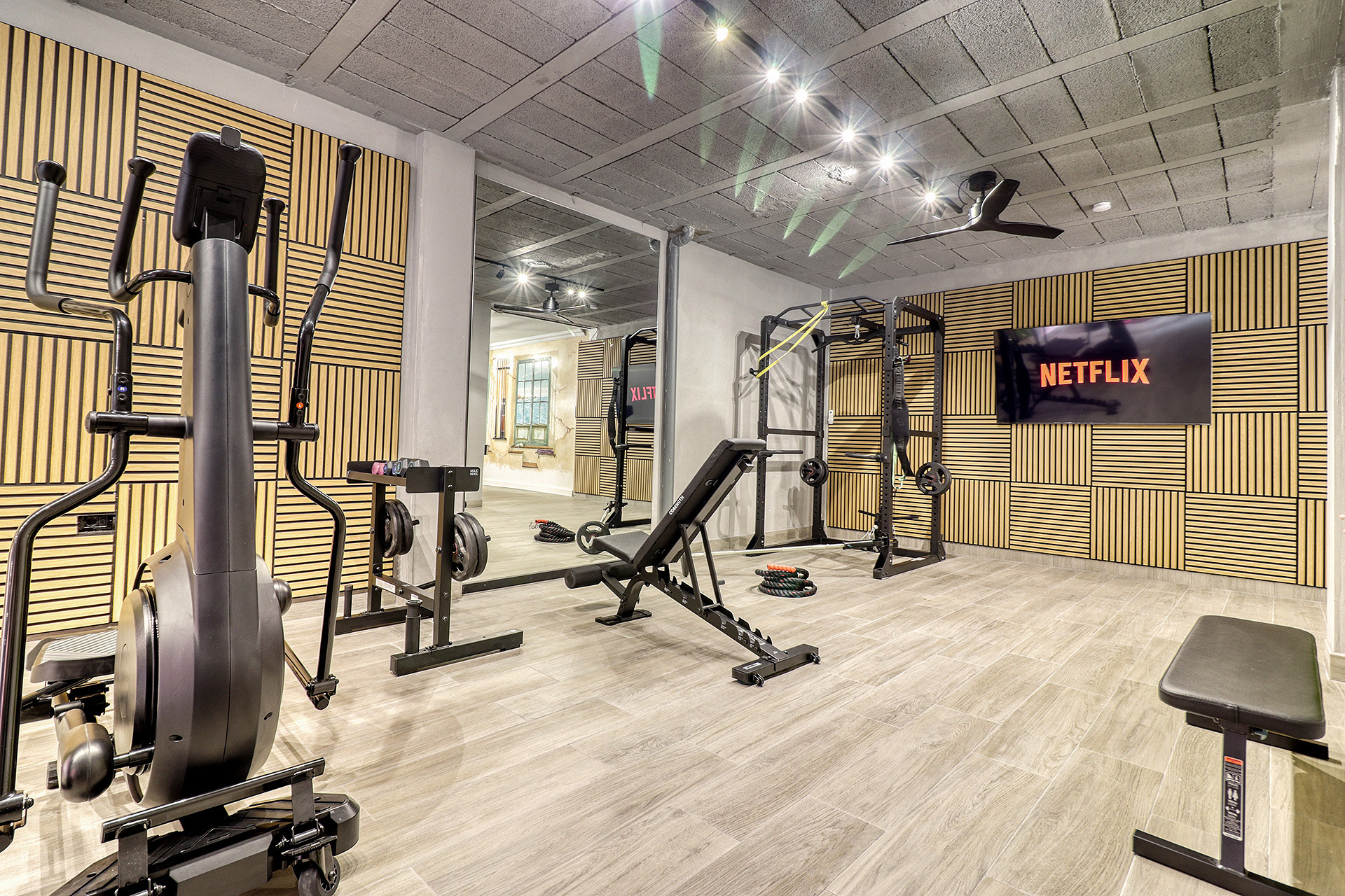 • Salle de sport privée avec tapis de course, vélo et poids
